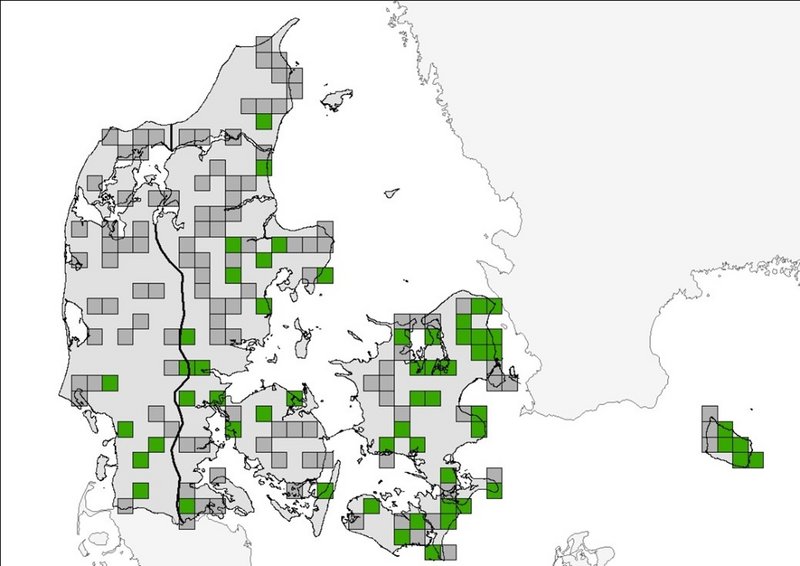 Figur 1. Forekomst og udbredelse af brun langøre i de 171 undersøgte UTM-kvadrater i NOVANA-overvågningen i perioden 2018-2021. Grønne markeringer viser UTM-kvadrat med fund af arten, og de grå kvadrater viser undersøgt UTM-kvadrat uden fund. Grænsen mellem den atlantiske og den kontinentale biogeografiske region er vist med en sort streg.