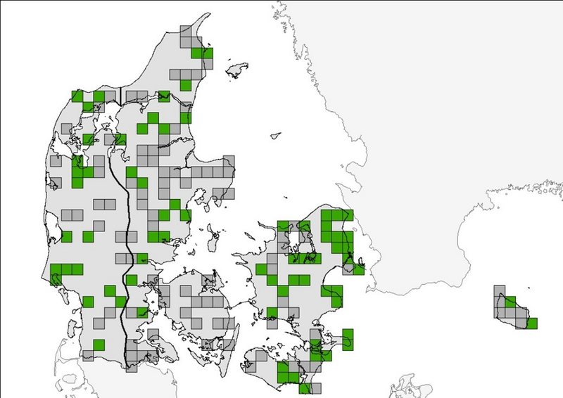 Tabel: Antal lokaliteter og UTM-kvadrater med forekomst af skimmelflagermus ved den ekstensive overvågning i 2018-2021 i Danmark. Nogle lokaliteter dækker to UTM-kvadrater. ATL: atlantisk region, CON: kontinental region.