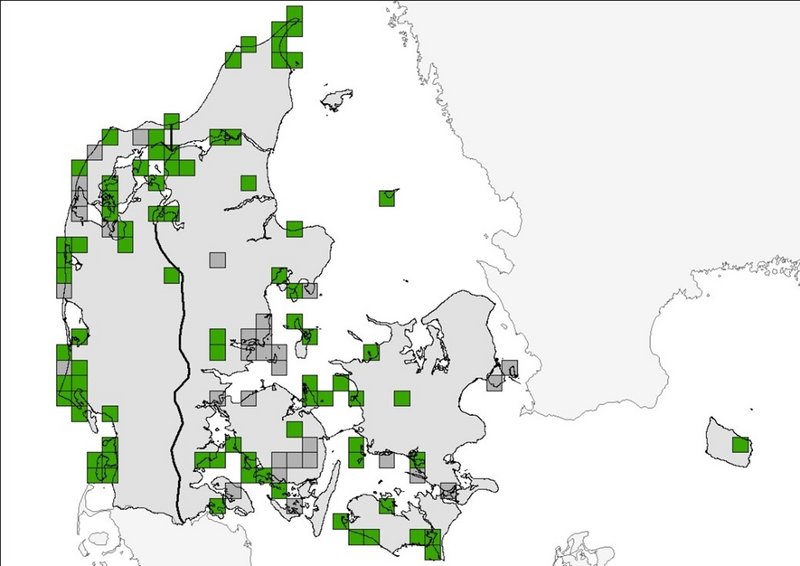 De mest udbredte forekomster er i dag i Limfjordsegnene med tilstødende landsdele, især omkring den vestlige del af Limfjorden. Siden 2012-17 er den således gået svagt frem i den Atlantiske region (Tabel 27.2). I Østjylland og på Øerne er der mest tale om spredte, overlevende bestande, og arten er helt forsvundet fra store dele af Sjælland, men det samlede antal kvadrater med arten er steget (Figur 27.1; Adrados 2007). De højere tal siden 2005-2011 kan måske også delvist forklares af introduktion af nattelytning mellem første og anden periode.