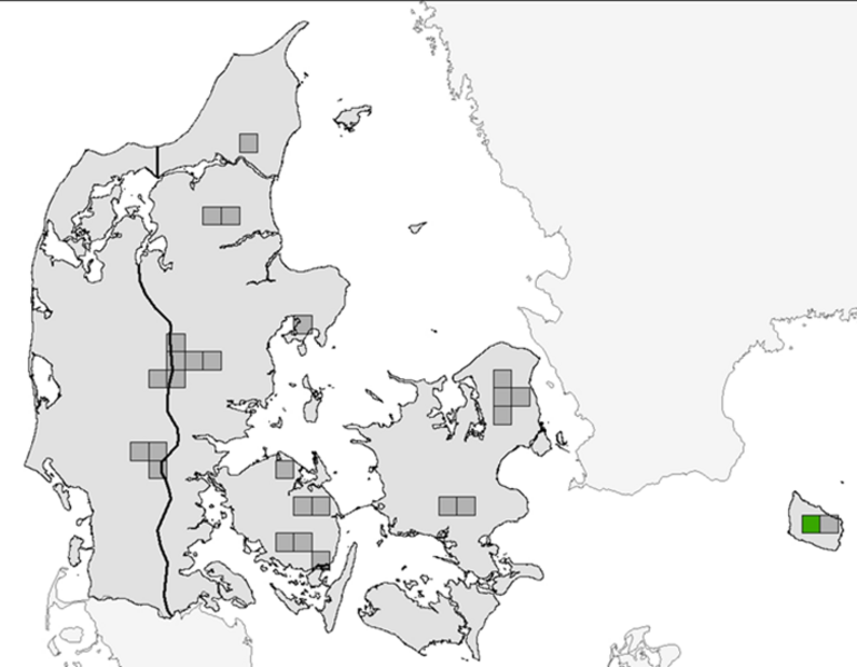 Udbredelseskortet (figur 7.1) viser fordelingen af kvadrater, hvor bred vandkalv blev eftersøgt i 2021/22, og det fyldte kvadrat (grønt) viser det kvadrat, hvor bred vandkalv blev fundet.