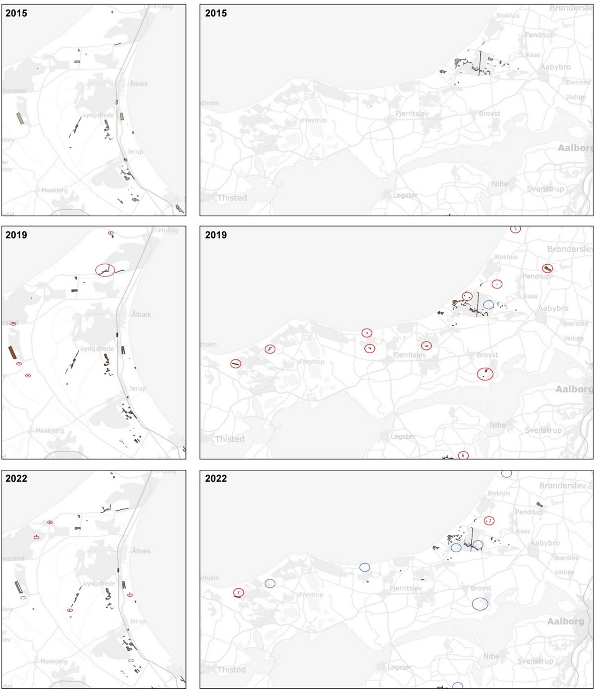Figur 6.2 Udbredelse af lokaliteter med hedepletvinge i årene 2015, 2019 og 2022. Panelet til venstre viser den ’Nordjyske’ bestand og panelet til højre den ’Nordvestjyske’. En rød cirkel illustrerer en nyopdaget bestand i forhold til det forgangne år og en blå illustrerer en bestand, der er forsvundet.