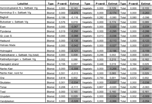 Tabel 5.3. Udviklingen af de lokale bestande af mygblomst i perioden 2004-2022. For hver lokalitet er angivet p-værdi og estimat for vegetative (med et eller to blade), blomstrende planter (med kapsler, aborterede kapsler eller afbidte stængler), samt det totale antal. Signifikant fremgang (positivt estimat og p < 0,05) er vist med lys grå, signifikant tilbagegang (negativt estimat og p < 0,05) er vist med mørk grå. Udviklingstendensen er analyseret med en generaliseret lineær model med poisson fordeling af responsvariablen. Analysen er lavet med PROC GENMOD i SAS 9.4 (Littell m.fl. 2002).