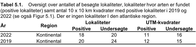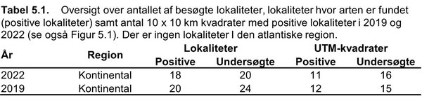 | Bilag II og IV | Truet (EN) | Ikke vurderet1 | Moderat ugunstig | Registreret på 18 lokaliteter | Ikke vurderet1 | Positiv |