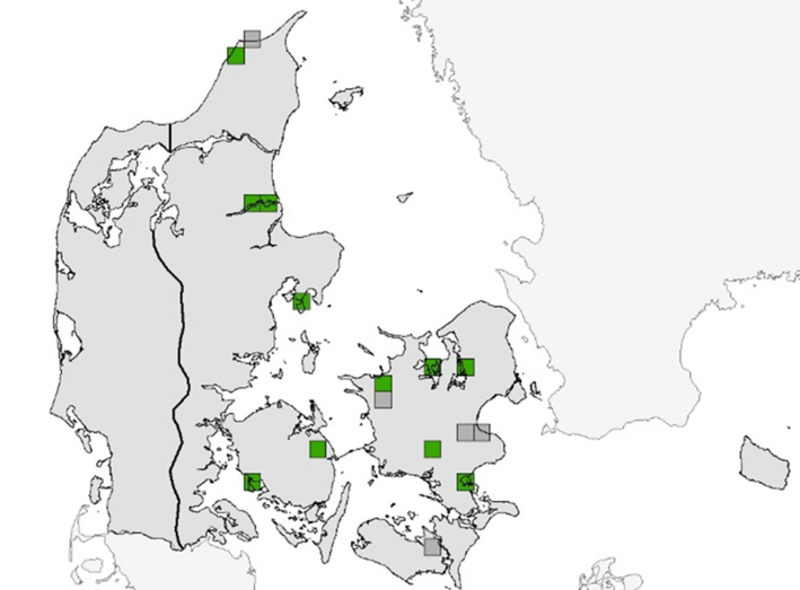 I 2022 blev mygblomst overvåget på i alt 20 lokaliteter fordelt på 16 UTM-kvadrater. Af dem, blev arten registreret på i 18 lokaliteter fordelt på 11 UTM-kvadrater (Figur 5.1, Tabel 5.1), hvilket er et UTM-kvadrat mindre end i 2019. Dette skyldes at der ikke blev fundet mygblomst i Torsø i 2022. I 2022 blev der desuden ikke fundet mygblomst i Bagholt ved Haslev.
