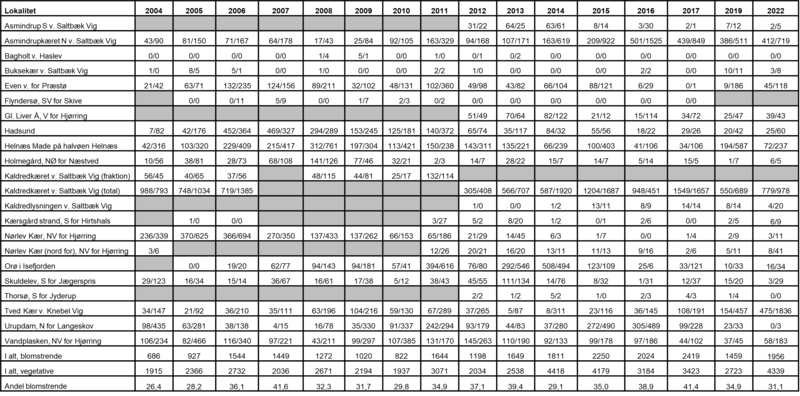 Tabel 5.2. Oversigt over de overvågede lokaliteter med bestande af mygblomst i perioden 2004-2022. For hvert år er angivet det samlede antal blomstrende (B) (i tælleren) og vegetative (V) planter (i nævneren). De vegetative planter har et eller to blade og de blomstrende er planter med kapsler, aborterede kapsler eller afbidte stængler. Grå celler indikerer, at arten ikke er overvåget i det pågældende år. Registreringerne i Kaldredkæret blev foretaget som en totaloptælling i 2004-2006 og 2012-2022, mens en repræsentativ delmængde af bestanden er optalt i hele perioden 2004-2011 (dog ikke i 2007). I 2008-2011 er kun registreret 8 % af Kaldredfraktionen.