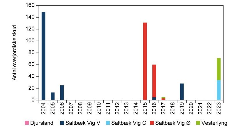 I 2023 blev der registreret overjordiske skud af enkelt månerude på to lokaliteter, hhv. 34 skud på Saltbæk Vig C og 37 skud på Eskebjerg Vesterlyng (Tabel 6.2 og Figur 6.2). Antallet af overjordiske skud af enkelt månerude har varieret i overvågningsperioden både på de enkelte lokaliteter og den samlede bestand. På grund af den ringe højde, nedbidning på græssede lokaliteter og tidlig nedvisning er enkelt månerude meget let at overse, og arten er i stand til at overleve en periode under jorden uden at sætte overjordiske skud. Det største antal overjordiske skud blev registreret ved overvågningens start i 2004 på den vestlige lokalitet ved Saltbæk Vig (149 individer), men antallet faldt betragteligt allerede året efter. Der blev ikke registreret overjordiske skud på lokaliteten i en periode på otte år (2008-2015), hvorefter der igen blev registreret et mindre antal skud. I 2015 dukkede enkelt månerude op i den østlige del af Saltbæk Vig med 131 overjordiske skud og i 2023 på en ny lokalitet i den centrale del af Saltbæk Vig med 34 skud. Arten blev fundet på en ny lokalitet på Eskebjerg Vesterlyng i 2017 med to overjordiske skud, og den er genfundet her i 2023 efter at have været fraværende i 2019 og 2021. På Djurslands lokaliteten ved Fjellerup er arten ikke fundet siden 2005. Variationen i antallet af registrerede skud skal ses i sammenhæng med artens biologi og dens størrelse, der gør, at den let kan overses, ligesom den kan overleve en periode under jordoverfladen uden at sætte overjordiske skud.