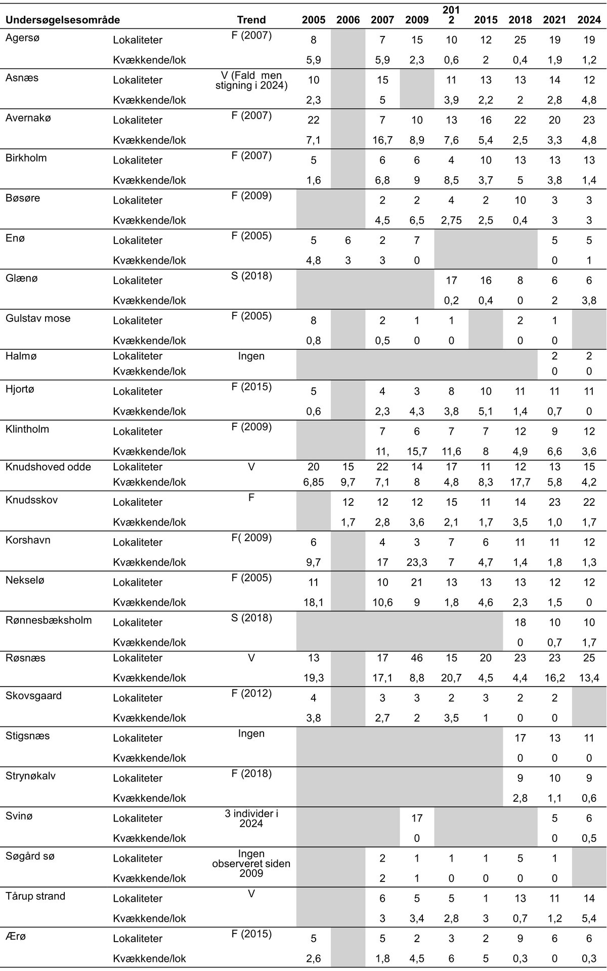 Tabel 10.3. Oversigt over de overvågede undersøgelsesområder med klokkefrø i perioden 2004-2024. Antallet af lokaliteter (vandhuller) og antallet af kvækkende hanner per lokalitet (Kv/lok) præsenteres for hvert undersøgelsesområde. På den enkelte lokalitet anvendes data fra det besøg med flest registrerede individer. Udviklingen indikeres med en trend for det enkelte undersøgelsesområde (F-fald, V-variabel, S-stigende og ”Ingen” for områder uden fund af klokkefrø. Grå celler indikerer, at arten ikke er overvåget i det pågældende indsamlingsår.