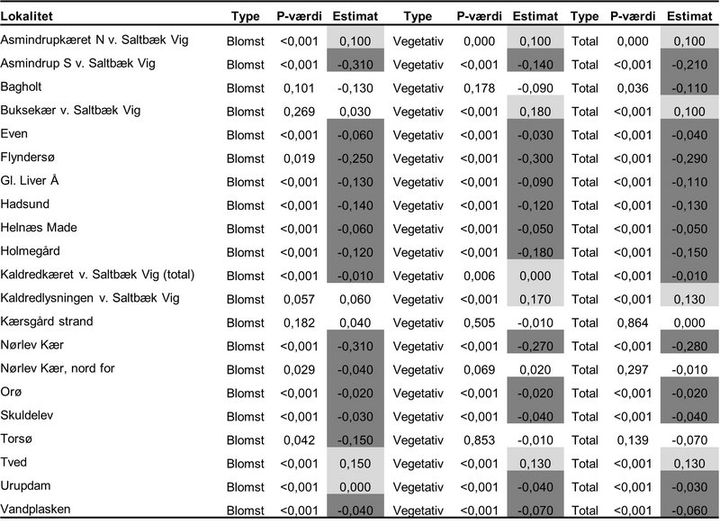 Tabel 5.3. Udviklingen af de lokale bestande af mygblomst i perioden 2004-2024. For hver lokalitet er angivet p-værdi og estimat for vegetative (med et eller to bla-de), blomstrende planter (med kapsler, aborterede kapsler eller afbidte stæng-ler), samt det totale antal. Signifikant fremgang (positivt estimat og p < 0,05) er vist med lys grå, signifikant tilbagegang (negativt estimat og p < 0,05) er vist med mørk grå. Udviklingstendensen er analyseret med en generaliseret lineær model med poisson fordeling af responsvariablen. Analysen er lavet med PROC GENMOD i SAS 9.4 (Littell m.fl. 2002).