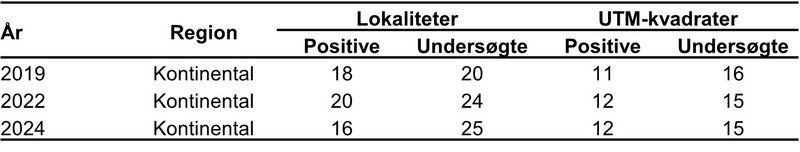 Tabel 5.1. Oversigt over antallet af besøgte lokaliteter, lokaliteter hvor arten er fundet (positive lokaliteter) samt antal 10 x 10 km kvadrater med positive lokaliteter i 2019, 2022 og 2024 (se også Figur 5.1). Der er ingen lokaliteter I den atlantiske region.