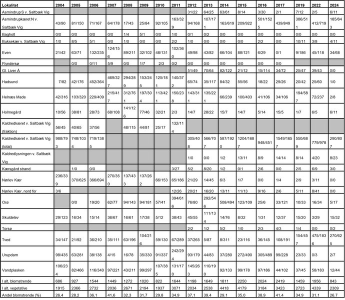 Der er sammenlagt registreret 843 blomstrende og 2.309 vegetative individer, hvilket er det laveste antal siden 2010 (Tabel 5.2, Figur 5.2). Andelen af blomstrende planter varierer mellem 26,4 og 41,6 % af det samlede antal individer gennem perioden. I 2024 var der den næstlaveste andel blomstrende planter (26,7%), kun højere end i 2004. Samtidig er der, ligesom foregående år, registreret relativt få individer i den store sjællandske bestand, Forklædet på Orø – det lavestes antal siden det første individ blev registreret i 2006. I de fynske bestande er der i 2024 optalt det færreste antal individer i hele NOVANA-perioden i Helnæs-bestanden og for Urupdam-bestanden det færreste antal ud over i 2022 (Tabel 5.2).