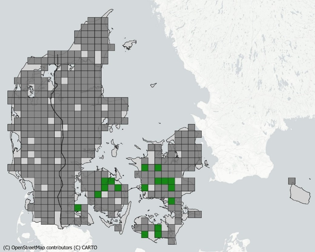 Figur 19.1. Udbredelse af pigsmerling i 10 km-kvadrater i overvågningsperioden for NOVANA-overvågningen i 2018-2023. Grønne kvadrater viser kvadrat med fund af pigsmerling, og de grå kvadrater viser kvadrater uden fund, men som er en del af overvågningsprogrammet. Grænsen mellem den atlantiske og den kontinentale biogeografiske region er vist med en sort streg.