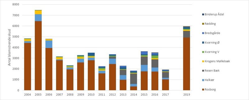I 2019 er der sammenlagt registreret 6.195 blomstrende skud, hvilket er det højeste antal siden 2005 og en markant forøgelse af den nationale bestand efter en lang periode med en negativ bestandsudvikling. Det høje antal blomstrende skud skyldes især en markant fremgang i den største bestand ved Rosborg sø, der næsten er femdoblet fra 2017 til 2019. På trods af denne fremgang viser overvågningsdata et signifikant fald i den samlede bestand i perioden 2004-2019.