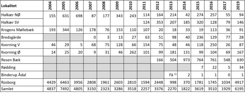 Resultaterne af den intensive overvågning af gul stenbræk i perioden 2004-2019 viser, at antallet af blomstrende skud svinger fra år til år i de enkelte bestande. En statistisk analyse af den overordnede trend viser, at der er en signifikant tilbagegang i den nationale bestand (Figur 2, p< 0,001). Analysen estimerer en relation for hver lokalitet og bedømmer overordnet om der er en trend henover årene. Der er også en signifikant tilbagegang for Rosborg-bestanden gennem perioden (p<0,001). Så det høje antal registrerede skud i 2019 kan ikke alene kompensere for de lave bestandsmål omkring 2014.