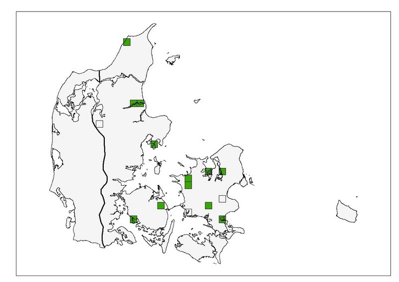 Overvågningen af mygblomst omfatter dels en fastlæggelse af artens udbredelse udtrykt ved antallet af UTM-kvadrater og lokaliteter arten optræder i (Tabel 1 og Figur 1), dels en systematisk bestandsopgørelse. En bestand er en samling af enkeltindivider af mygblomst på et levested. Bestandens udstrækning fastlægges ved hjælp af GPS. På grund af den vegetative formeringsform er det ikke muligt i felten at adskille de enkelte individer, uden at grave dem op. Derfor opgøres artens bestandsstørrelse som antallet af skud. Overvågningen udføres ved en systematisk totaloptælling af alle individer, der opdeles på vegetative individer med ét eller to løvblade samt på blomstrende individer, der er planter med kapsler, aborterede kapsler eller afbidte stængler. Antallet af blomstrende og dermed de potentielt frugtsættende individer er et udtryk for bestandens formeringspotentiale. Endvidere registreres en række levestedsdata i form af biotiske og abiotiske faktorer, jf. den tekniske anvisning (Wind & Nygaard 2012). Metoden er nogenlunde uændret gennem de tre programperioder. Dog blev der foretaget en totaloptælling af landets største bestand i Kaldredkæret ved Saltbæk Vig (”Forklædet”) i 2004-2006. Denne optælling blev i 2004 suppleret med en registrering af en repræsentativ delmængde (fraktion) af bestanden og denne fraktion er overvåget gennem perioden 2004-2019 (dog ikke 2007).