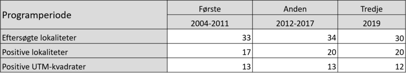 NOVANA-programmets systematiske gennemgang af potentielle levesteder med arten har ført til, at antallet af kendte levesteder og bestande er øget siden 2004 (Tabel 1 og 2).