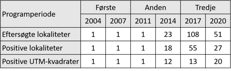 Den målrettede eftersøgning har medført en betragtelig stigning i antallet af sporehuse i 2014, 2017 og 2020 i forhold til de tre første optællingsår (Tabel 2). Antallet af optalte sporehuse (inkl. henfaldne sporehuse og setae) af grøn buxbaumia er faldet fra 2027 i 2014, over 1596 i 2017 til 1105 i 2020. Faldet i perioden 2014 til 2017 skyldes hovedsageligt en væsentlig reduktion i antallet af sporehuse i nogle af de store bestande. Selv registreringen af 43 nye lokaliteter i 2017 har ikke kunne opveje faldet i antallet af sporehuse. Faldet fra 2017 til 2020 kan ikke tolkes som en nedgang i bestandsstørrelser, da arten blev eftersøgt på flere lokaliteter i 2017 end 2020, og da en stor del af de besøgte lokaliteter i 2020 ikke overlapper med lokaliteterne i 2017. Det er derfor vanskeligt at udtale sig om bestandsudviklingen. Arealerne af bestandene er oftest små (Tabel 2), men ligesom for antallet af sporehuse er det svært at konkludere noget om udviklingen i bestandsarealer pga. de skiftende lokaliteter. I 2020 var henfaldende nåletræ det primære levested for grøn buxbaumia, og fundene blev især gjort på stammer eller stubbe af nåletræ under nedbrydning.