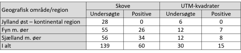 I perioden 2018-2019 blev hasselmus overvåget i 139 skove i 30 UTM-kvadrater (10x10 km). Hasselmus blev fundet i 60 af de undersøgte skove på Sydfyn og i tre skovområder på Sjælland ved Sorø-Slagelse, Hvalsø og Rønnede, svarende til i alt 15 UTM-kvadrater (Figur 1, Tabel 1).