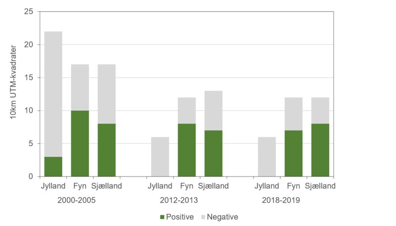 Bilag IV | Ukendt (fundet i 15 UTM-kvadrater) | Faldende (2004-2019) |