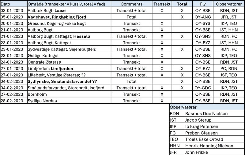 I 2023 dækkede den landsdækkende optælling det meste af de indre danske farvande, samt sydlige Nordsø. Der blev i perioden 3. Januar - 28. februar gennemført i alt 15 flytællinger (Tabel 1) og knap 2.150 lokaliteter blev dækket fra landjorden (Figur 2).