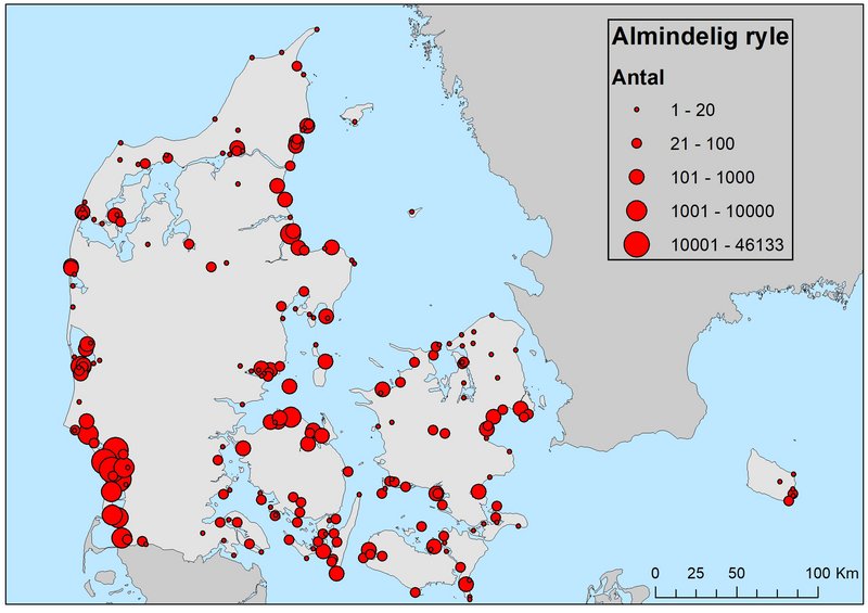 I oktober 2018 blev der registreret i alt 151.320 almindelige ryler i Danmark. Hovedparten (128.049) blev talt i Vadehavet.