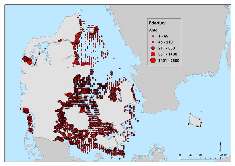 I de mere marine områder blev flest fugle registreret i det Sydfynske Øhav, den vestlige del af Smålandsfarvandet og op igennem Storebælt til den sydlige del af Kattegat, Vadehavet og farvandet omkring Læsø (Figur 3). På mere kystnære lokaliteter, hvor der samtidigt også blev foretaget totaloptællinger, blev der registreret mange fugle i Horsens Fjord (3.446), Odense Fjord (3.535) og Roskilde Fjord (2.317).