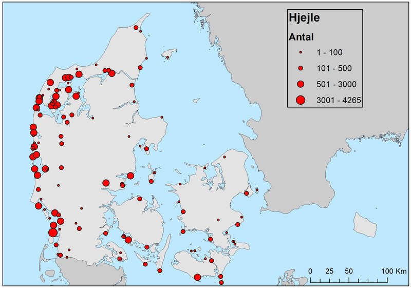 Under optællingen i april 2019 blev der i alt registreret 58.637 hjejler. Langt de fleste store forekomster sås i Jylland, særligt i Vestjylland og omkring Limfjorden (Figur 2). I Vadehavet blev der i alt talt 9.498, heraf 4.265 omkring det nordlige Rømø, og de øvrige områder ved Vadehavet med mange hjejler udgjordes af Mandø samt marsken ved Sdr. Farup. Fra resten af landet var de største flokke 3.000 Gyllingnæs nær mundingen af Horsens Fjord, 2.800 Klegod, Holmsland Klit, 2.500 Bøvling Klit og 2.500 Dråby Vig.