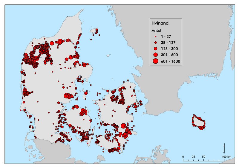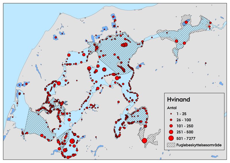 På de to seneste landsdækkende midvintertællinger i 2013 og 2016 blev der registreret henholdsvis 52.535 og 70.116 hvinænder (Tabel 2). Det registrerede antal i 2016 var noget højere end antallet i 2013, men mere sammenligneligt med tidligere tællinger. Arten registreres om vinteren over hele landet, men med de største forekomster i Limfjorden ved begge de seneste landsdækkende tællinger. Andre områder med høje antal i 2016 var Ringkøbing Fjord, Mariager Fjord, Horsens Fjord, Roskilde Fjord, Isefjord og farvandet mellem Sjælland og Møn/Falster (Figur 2).