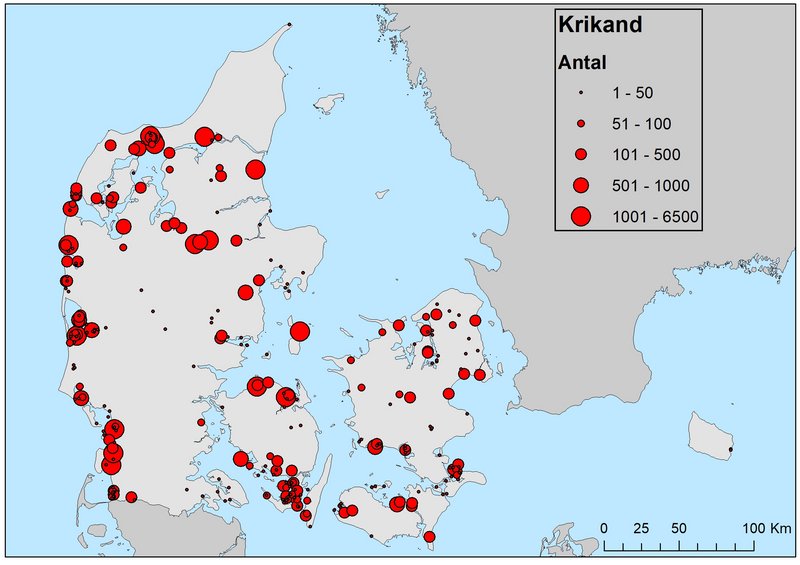 Krikand forekom ved den seneste oktobertælling i 2018 i store antal i Vadehavet (14.793 talt fra land, et meget højt antal for området), Ringkøbing Fjord med Skjern Enge (4.563), i Vejlerne (7.677 samlet i de Østlige og Vestlige Vejler) samt ved Ulvedybet (3.500). På øerne blev de største antal truffet ved de naturgenoprettede område ved Gyldensteen Strand (2.689) samt Ulvshale-Nyord (1.458) (Figur 1). Saltholm blev ikke talt.