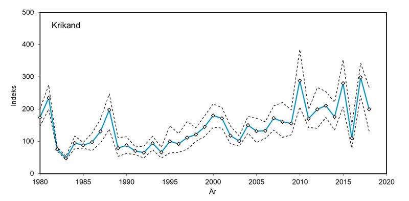 Det samlede antal af krikænder i oktober 2018 var på 66.209 fugle, det næsthøjeste antal, der er er registreret siden 2004 og kun overgået af antallet i 2015 (Tabel 2; Nielsen m.fl. 2019). Der er betydelige år-til-år variationer i antallet i Danmark, som bl.a. påvirkes bl.a. af sommerens ynglesucces, hvilket er påvist både for Vadehavet og Ringkøbing Fjord (Laursen & Frikke 2006, Meltofte & Clausen 2011). Set i det lange perspektiv er der, bedømt ud fra 62 regelmæssigt overvågede lokaliteter 1980-2018, en stigende bestand i den lange periode og en stabil bestand på et højere niveau i den korte (Figur 3).