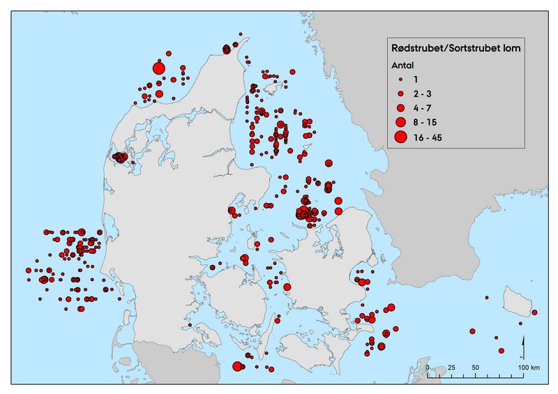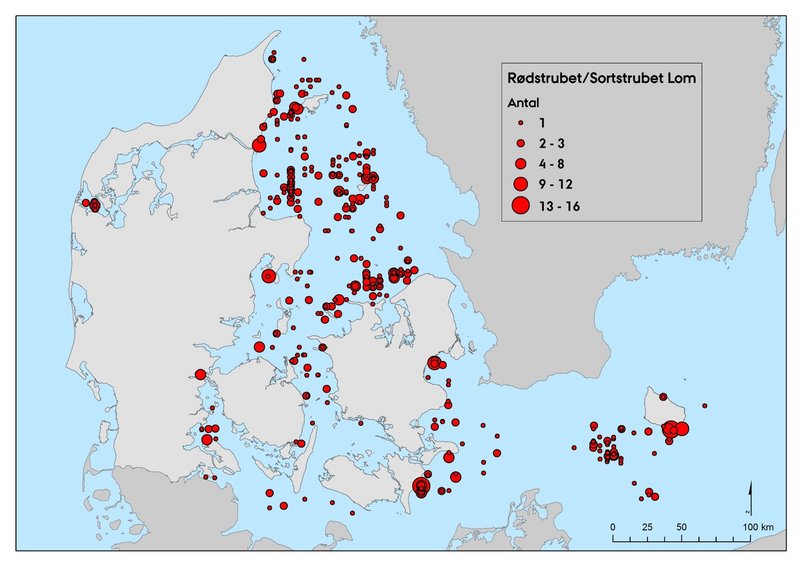På de to seneste optællinger ved midvinter i 2013 og i 2016 blev der i alt registreret henholdsvis 880 og 740 rødstrubede/sortstrubede lommer (Tabel 1). Størstedelen af de registrerede fugle blev artsbestemt til rødstrubet lom, som også er den mest talrige af de to arter i Danmark. På tællingen foretaget i 2016 blev der registreret pæne antal af sortstrubet lom (43 fugle) omkring Bornholm. Islom og hvidnæbbet lom blev som vanligt kun registreret sparsomt på de to tællinger og kun i den nordlige del af Kattegat.
