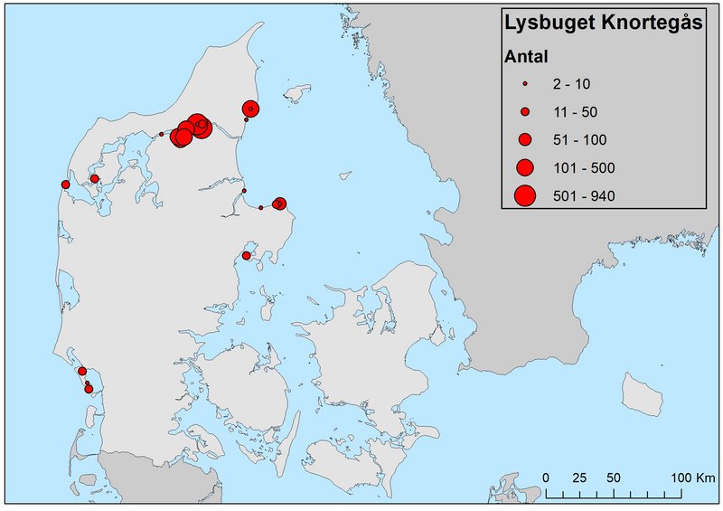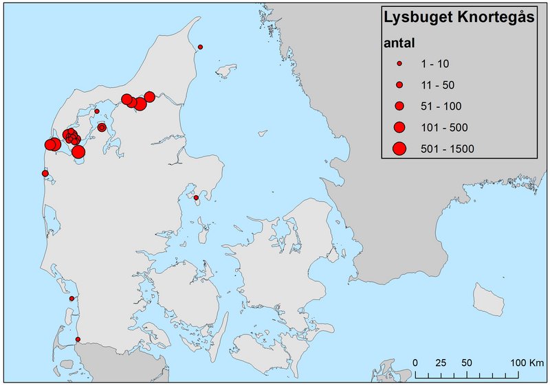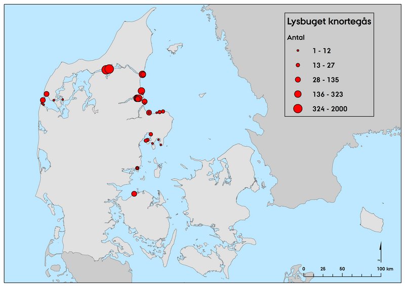 Lysbuget knortegås var ved den seneste midvintertælling i januar 2019 i lighed med tidligere år langt overvejende udbredt i Limfjorden og langs østkysten af Kattegat fra Stensnæs i Vendsyssel til Norddjursland. Dertil kommer mindre forekomster omkring Harboøre Tange, Agerø, omkring Mols, ved Gyllingnæs og på Nordfyn (Figur 1).