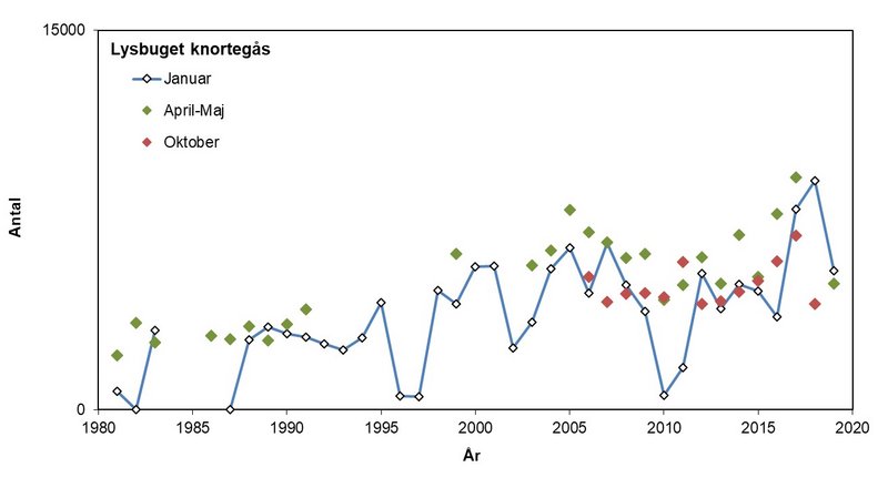 Antallet af lysbugede knortegæs ved optællingerne i januar varierer generelt meget med vinterforholdene, med lave antal i kolde vintre som fx årene 1996-1997 og 2010-2011 og højere antal i mildere vintre som fx 2018-2019 (Figur 4), men er set i det lange løb stigende i takt med den generelle bestandsudvikling.