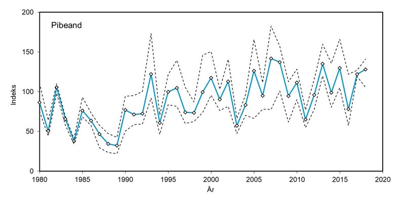 Det samlede antal af pibeænder optalt ved den seneste oktobertælling i 2018 var på knap 200.000 fugle, hvilket er højt i betragtning af, der ikke kunne udføres flytælling i Vadehavet i oktober. Der er ikke nogen entydig tendens i udviklingen i antallet fra 2004-2018 (Tabel 2), hvor år med under 150.000 fugle ofte er karakteriseret ved en manglende flytælling i Vadehavet (jf. Nielsen m.fl. 2019). Set i det lange perspektiv er der, bedømt ud fra 62 regelmæssigt overvågede lokaliteter, er der i den lange tidsperiode fra 1980-2018 set en fremgang, og i den kortere periode en stabil bestand på et højere niveau (Figur 3).