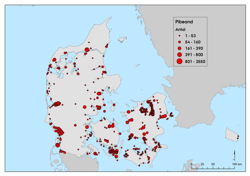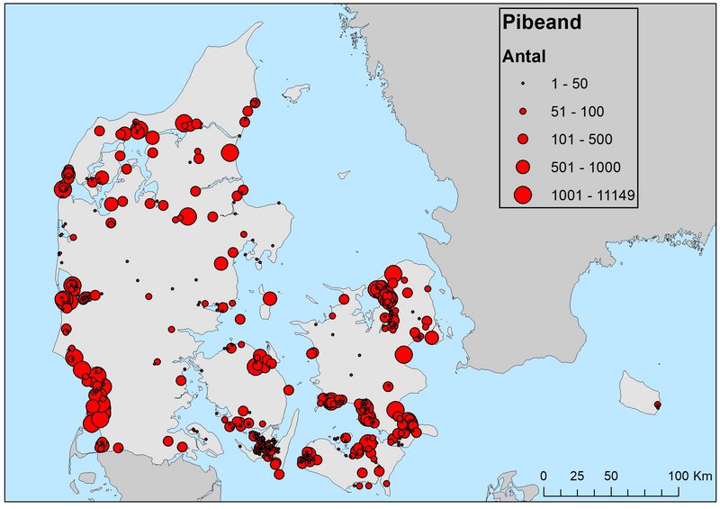 Der blev registreret henholdsvis 20.028 og 29.249 pibeænder på de landsdækkende optællinger ved midvintertællingen i 2013 og 2016 (Tabel 1). Det lavere antal fugle registreret i 2013 skyldes, at der ikke blev gennemført en flytælling af artens vigtigste overvintringslokalitet, Vadehavet, hvorfor der kun er vist et kort med fordelingen i 2016. Arten kan om vinteren ses over det meste af landet, men dog med langt hovedparten i Vadehavet og i flere af landets større reservatområder som fx ved Ulvedybet, i det Sydfynske Øhav og Roskilde Fjord, samt i de naturgenoprettede Skjern Enge (Figur 2).