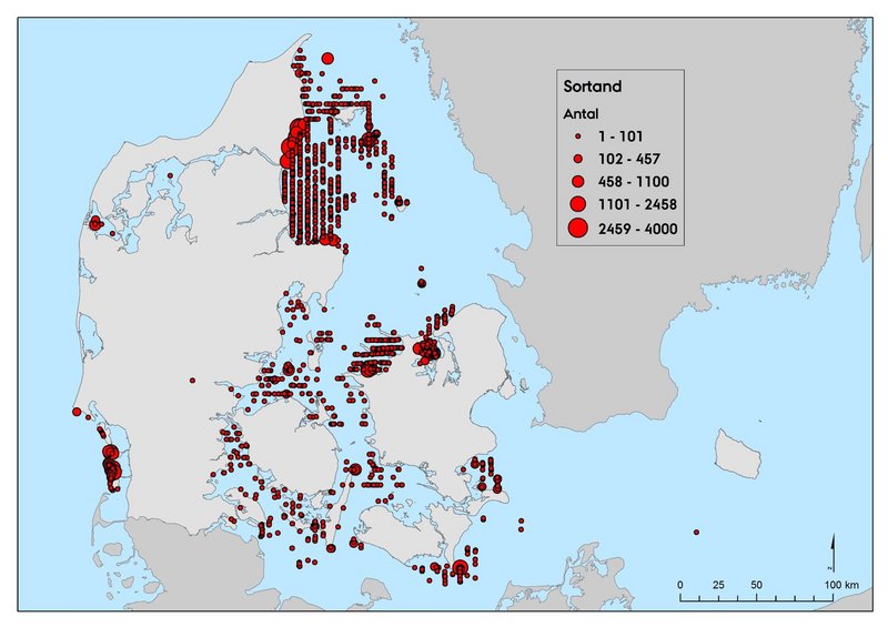 På de to seneste landsdækkende midvintertællinger i 2013 og 2016 blev der registreret 58.405 og 77.517 sortænder (Figur 1 og 2). Om vinteren registreres arten over det meste af de indre danske farvande, men flest fugle registreres typisk i Aalborg Bugt. Andre områder med betragtelige antal er Sejerø Bugten, Isefjorden (2016) og sydlige Nordsø. I 2016 blev der registreret en stor forekomst i Isefjord (>10.000), hvilket er bemærkelsesværdigt, men området huser formentlig store antal dykænder de fleste år.
