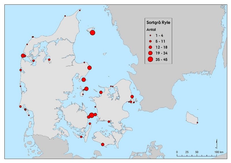 Udbredelsen af sortgrå ryle ved optællingen i 2016 er vist i Figur 1. Lokaliteterne med de største forekomster (11-45 individer) var: Blåvand/Hvidbjerg Strand, Thyborøn Havn/Agger Tange, Læsø syd, Grenå Havn, Ebeltoft Færgehavn/Gåsehage, Bosserne (øst for Samsø), Knudshoved ved Nyborg, Sprogø, Ordrup Næs, Halsskov Havn, Nordhavnen i København og Rødbyhavn. Der forelå ikke optællinger fra en række øvrige lokaliteter, hvor der i tidligere år er registreret flere end 10 individer (deriblandt Nordre Rønner, Vresen og Musholm).