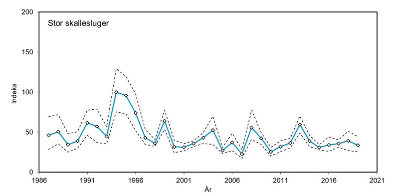 Set i det lange perspektiv tilbage til 1968 er bestanden af stor skallesluger i Danmark overordnet set stabil (Tabel 1), men med nogle forholdsvis store år-til-år variationer. Det ses også i de årlige indekstal, hvor der var særligt høje antal midt i 1990'erne, mens indeks ellers ligger mellem 30 og 60 i en 33-årig periode (Figur 3).