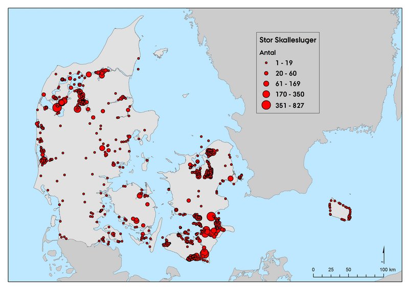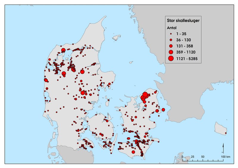 Stor skallesluger er en almindelig vintergæst i det meste af landet, men dog ret fåtallig i det sydvestlige Jylland (Figur 1, Figur 2). På den seneste landsdækkende midvintertælling blev flest fugle registreret i Limfjorden og langs kysterne af Sydsjælland og Lolland-Falster. I Nordsjælland, hvor Arresø og Roskilde Fjord traditionelt set er nogle af artens vigtigste overvintringsområder i Danmark, blev der set noget færre fugle i 2016 sammenlignet med i 2013.