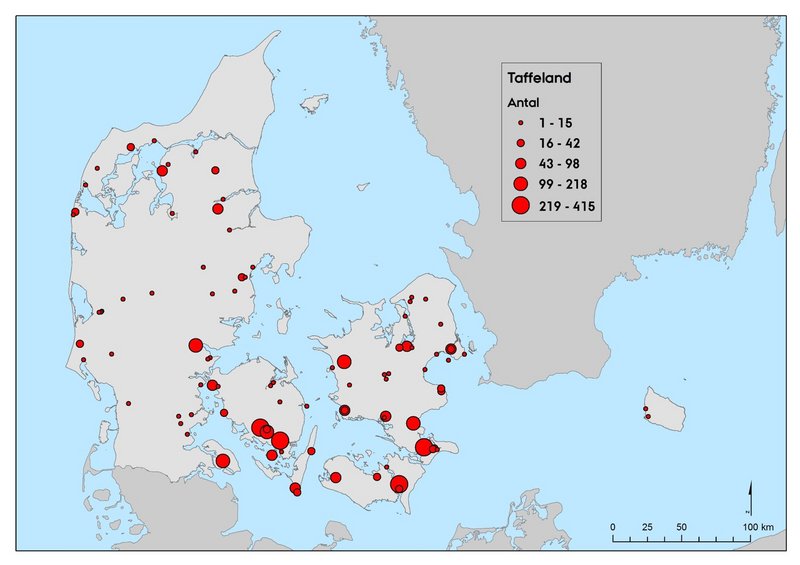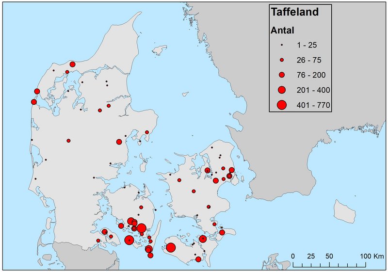 Der blev på de to seneste landsdækkende midvintertællinger i 2013 og 2016 i alt registeret henholdsvis 7.697 og 3.659 taffelænder på de to (Figur 1 og 2). Det samlede antal er noget lavere end ved de foregående landsdækkende tællinger (Tabel 1).