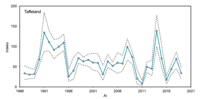 Bestandsindekset blev for 2018 og 2019 estimeret til henholdsvis 69,4 og 33,9, og viser betydelige år-til-år udsving, uden nogen entydig retning (Figur 2).