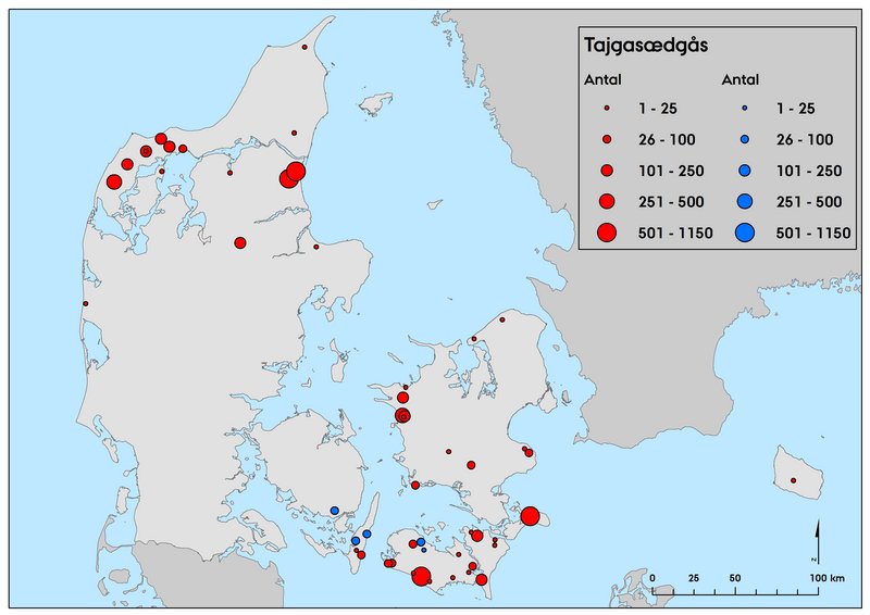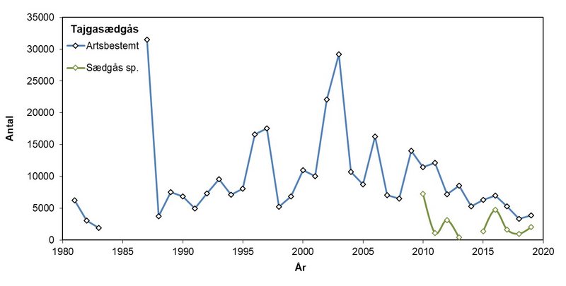Selv hvis hovedparten af de ikke-racebestemte sædgæs i 2018 og 2019 er tajgasædgæs, ligger landstotalerne ved januar-tællingerne i disse år lavere end ved tilsvarende tællinger gennem de seneste årtier (Figur 3). I de foregående fire år har januar-totalerne for ligget på et niveau omkring 5.000-7.000 fugle (plus et antal fugle indrapporteret uden raceangivelse), og i 1990'erne og 2000'erne, var der tilbagevendende forekomster på over 10.000 fugle (Figur 3). På flyway-niveau ser den centrale delbestand ud til at være i en positiv udvikling, mens den vestlige delbestand stadig er meget lille (Heldbjerg m.fl. 2020). Fuglenes udbredelse og fordeling i Danmark er temmelig stabil, og de lavere antal skyldes hovedsageligt færre fugle i de traditionelt benyttede områder. En del af forklaringen på det faldende antal overvintrende tajgasædgæs er formentlig de hyppigere lune vintre, hvor underarten er mindst talrig da fuglene i større omfang overvintrer i Sverige (Nilsson & Kampe-Persson 2020).