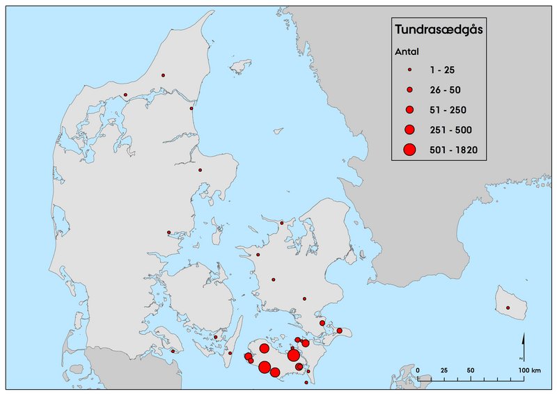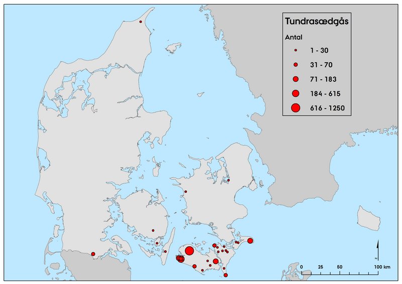Tundrasædgås optælles på kendte og regelmæssigt benyttede danske rastepladser, hvoraf de vigtigste findes i det sydøstlige Danmark.