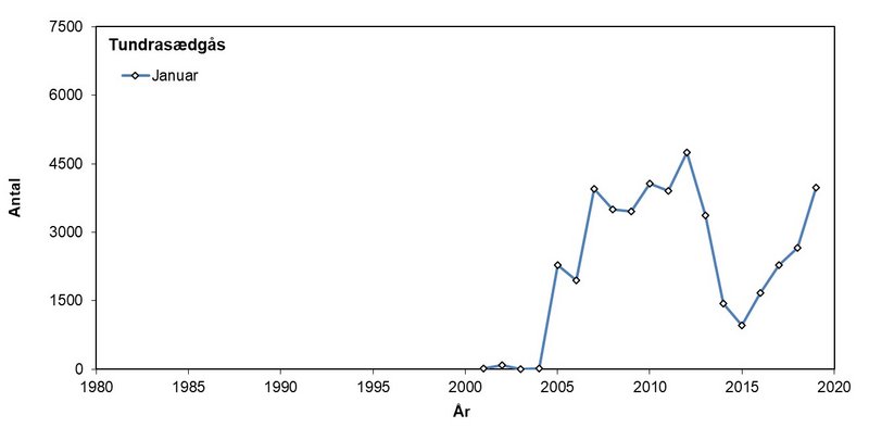 Antallet af tundrasædgæs i januar steg markant i årene 2005-2012, med den største forekomst tællende 4.747 individer i 2012. I perioden 2013-2015 var antallet af overvintrende tundrasædgæs i Danmark faldende, men siden da har bestanden igen været stigende og nåede i 2019 ca. 4.000 fugle (Figur 3). Samtlige tal må betragtes som minimumstal, da der alle år optræder sædgæs uden raceangivelse i tællingerne, hvoraf nogle sandsynligvis er tundrasædgæs. Ændringerne i antal ved midvinter kan ikke umiddelbart relateres til vinterens hårdhed, men kan tænkes at påvirkes af fødetilgængeligheden i både Syddanmark og på de traditionelle rastepladser syd herfor.