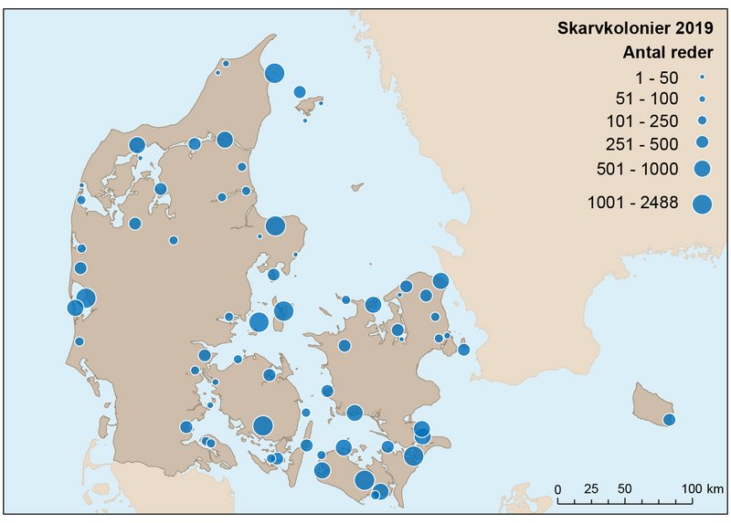 Der blev registreret ynglende skarver på 76 lokaliteter i 2018 og på 75 lokaliteter i 2019. Efter 2013 steg antallet af kolonier fra færre end 68 til at svinge mellem 73 og 84 i perioden 2014-2019. Landets største koloni har gennem hele perioden været Stavns Fjord på Samsø. Her blev der talt 2.422 reder i 2018 og 2.488 reder i 2019. I begge år var der kolonier i stort set alle egne af landet, men inde i landet forekom der kun kolonier i nærheden af større søer eller fjorde (Figur 2).