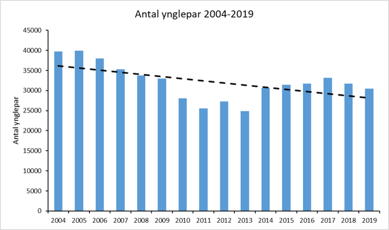I 2018 blev der registreret i alt 31.708 par, hvilket svarede til en tilbagegang på 4,5 % i forhold til 2017. I 2019 blev der registreret i alt 30.511 par, hvilket svarede til en tilbagegang på 3,8% i forhold til 2018. I perioden 2014-2019 har bestanden ligget mellem 30.511 og 33.186 par (Tabel 1).