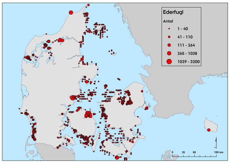 Den overvintrende bestand af ederfugle blev i 2020 estimeret til at være ca. 429.000 fugle. Den overvintrende bestand er senest modelleret i 2004 og 2008, dog findes der også tentative estimater fra 2013 og 2016 (Tabel 2). Antallet fra 2020 kunne tyde på en mindre tilbagegang i antallet af overvintrende fugle, men usikkerheder forbundet med optællingsmetode og variation mellem årene spiller nok også ind, hvorfor resultater fra fremtidige tællinger formentlig vil kunne give et mere præcist billede af bestandsudviklingen.