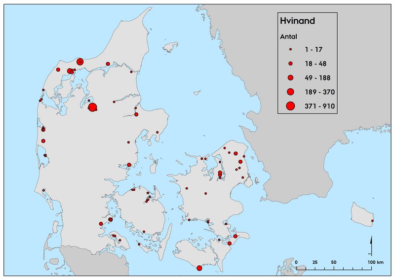 I sensommeren 2018 blev der registreret 2.341 hvinænder på på den landsdækkende optælling af fældende vandfugle, hvilket var marginalt flere end på den seneste optælling foretaget i 2012 (Tabel 1). Stigningen skyldes nok i høj grad den bedre dækning af søer og fjorde på tællingen i 2018. Fordelingen adskilte sig ikke fra fordelingen i 2012 (Figur 3). Flest fugle blev registreret i Hjarbæk Fjord (910), Lund Fjord (370) og Lønnerup Fjord (188), hvilket også var tilfældet i 2012. Det rapporterede antal indeholder formentlig også nogle få ynglefugle, dette dog nok primært fra Nordsjælland.