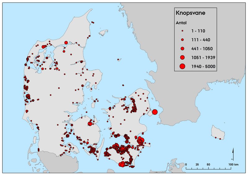 Der blev optalt omkring 53.000 knopsvaner på den landsdækkende midvintertælling i 2020 (Figur 1, Tabel 2), hvilket var lidt flere end på de senest udført landsdækkende tællinger. I 2021, hvor midvintertællingen ikke var landsdækkende, blev der i alt optalt 55.319. Den reducerede midvintertælling i 2021 dækkede langt de fleste, vigtige lokaliteter for arten, men nogle områder i det Sydfynske Øhav, omkring Rødsand og i Smålandsfarvandet dækkes bedst fra fly, hvorfor den registrerede total i 2021 må anses som værende noget konservativ. Fordelingen af knopsvane i 2020 og 2021 (Figur 1, Figur 2) var meget lig den observerede ved tidligere midvintertællinger. Flest fugle blev optalt i fjorde og lavvandede områder i det Sydfynske Øhav, ved Sydsjælland, Lolland, Falster, Møn, i Roskilde Fjord og ved Saltholm. Uden for øerne fandtes de største antal i Ringkøbing Fjord. På den landsdækkende fældefugletælling i sommeren 2018 blev der i alt optalt 69.404 knopsvaner (Figur 3),