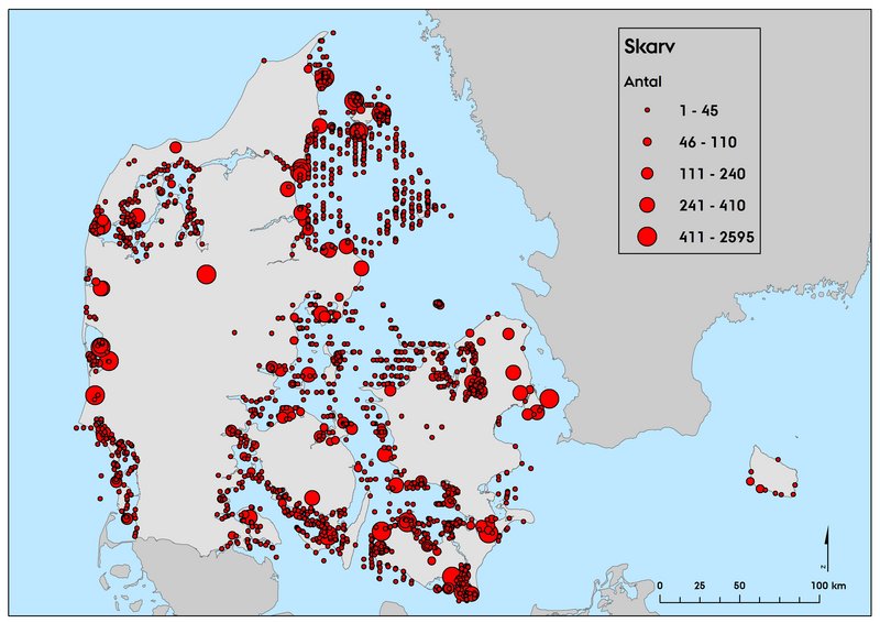 Ved den landsdækkende midvintertælling i 2020 blev der i alt talt 35.080 skarver. Den største koncentration var en flok på ca. 10.000 fugle ved Peberholm i Øresund (Figur 1).
