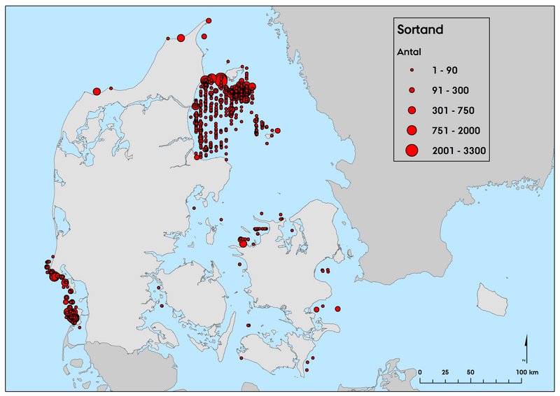 På den seneste landsdækkende midvintertælling i 2020 blev der i alt registreret 92.624 sortænder, hvoraf de ca. 29.200 (15.200 langs lokaliteter ved den jyske vestkyst) blev optalt i områder dækket af totaltællinger fra enten land eller fly. I området dækket af transekter blev der optalt 63.450 fugle resulterende i et totalt estimat for det område på 191.558 fugle (nedre og øvre konfidensgrænser 144.514 - 253.918). Et samlet estimat for den landsdækkende tælling er således 220.758, hvoraf de 205.558 var i de indre danske farvande (Tabel 1). Den egentlige total fra Sydlige Nordsø er formentlig meget højere end det registrerede antal fra land (14.942). Om vinteren registreres arten over det meste af de indre danske farvande, men flest fugle registreres typisk i Aalborg Bugt. Andre områder med betragtelige antal er Sejerø Bugten og Isefjorden. Sydlige Nordsø blev ikke dækket af flytællinger i 2020, men området er normalt meget vigtigt for arten, hvilket det baseret på de høje antal optalt i området fra land formentlig også var i 2020 (Figur 1). Sydlige Nordsø er desværre ikke blevet dækket på de seneste to landsdækkende midvintertællinger i 2016 og 2020, hvilket skyldes både at vejret i området om vinteren ofte ikke godt nok til optællinger fra fly, samt at militæret har forholdsvis store øvelsesområder, som begrænser adgangen til området betragteligt.